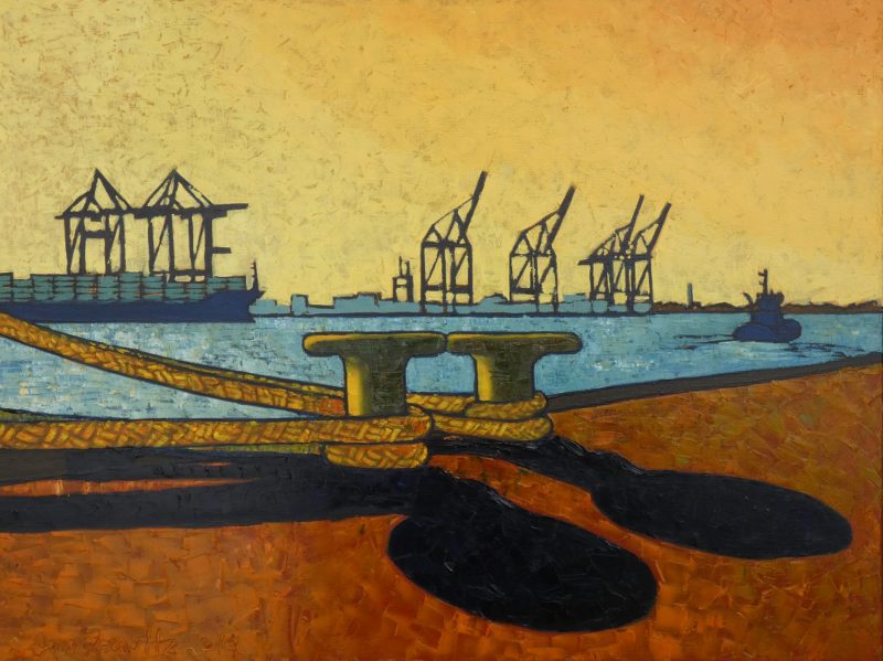 Als Vorlage dienen ihm dabei die schwarz-weiß Fotografien seines Vaters, der auf einer Werft arbeitete. Darüber hinaus geht der Künstler auch selbst am Hafen auf Motivsuche, „am liebsten in alten, etwas heruntergekommenen Ecke“, so Durstewitz. Als stiller Beobachter geht es ihm in seinen Bildern um das Filtern von architektonischen Grundformen. Schiffe, Kräne und Brücken als Form zu fassen.