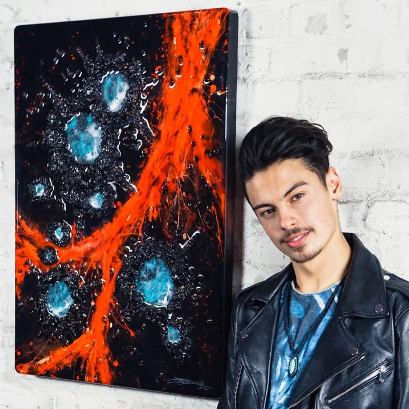 Ich möchte mit der Serie die Besucher näher mit der Kunst und mit der Natur in Verbindung bringen, um ihnen eine neue Sicht auf unsere Welt zu geben. Deshalb habe ich viele meiner Kunstwerke dreidimensional gestaltet, damit ihre Struktur und Aussage greifbar und spürbar zugleich wird.Diese Kunstwerke wurden mit echtem Vulkangestein realisiert, welches bis zu zehn Zentimeter aus dem Rahmen hervortritt. Hochwertiges Kunstharz lässt die Gemälde wie verglast erscheinen und verleiht ihnen eine einzigartige Erscheinung und Haptik.
